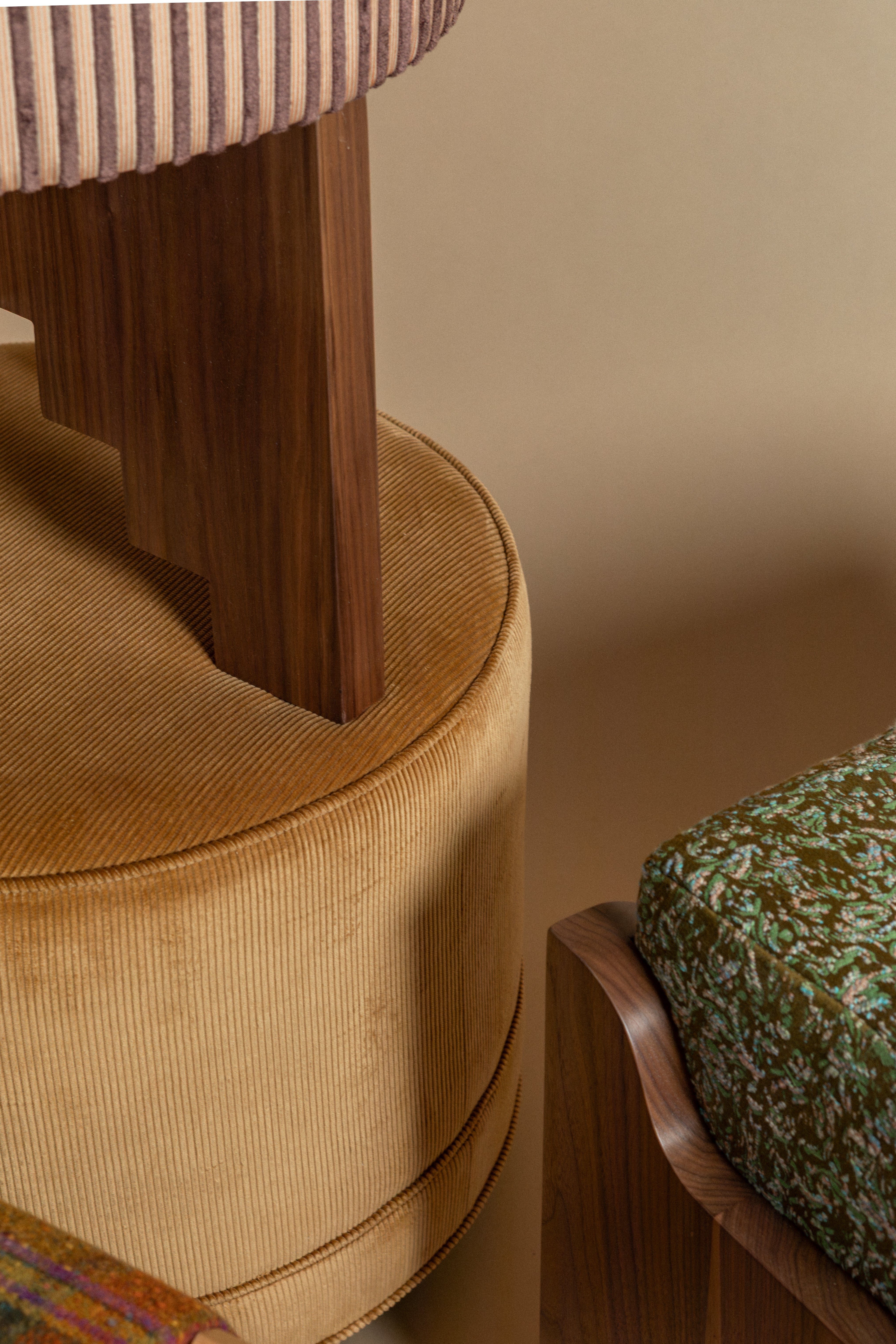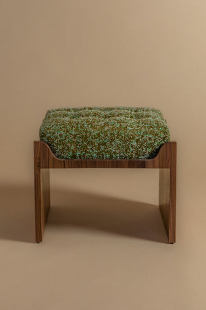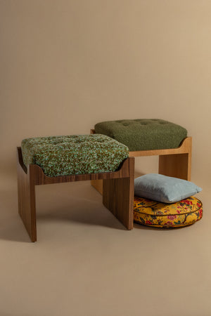 Pictured in two finishes, Brunel's olive jacquard with a natural walnut base, and a custom moss boucle with white oak base (the moss boucle is available to order but is not a stocked fabric in Brunel's made-to-order collection).