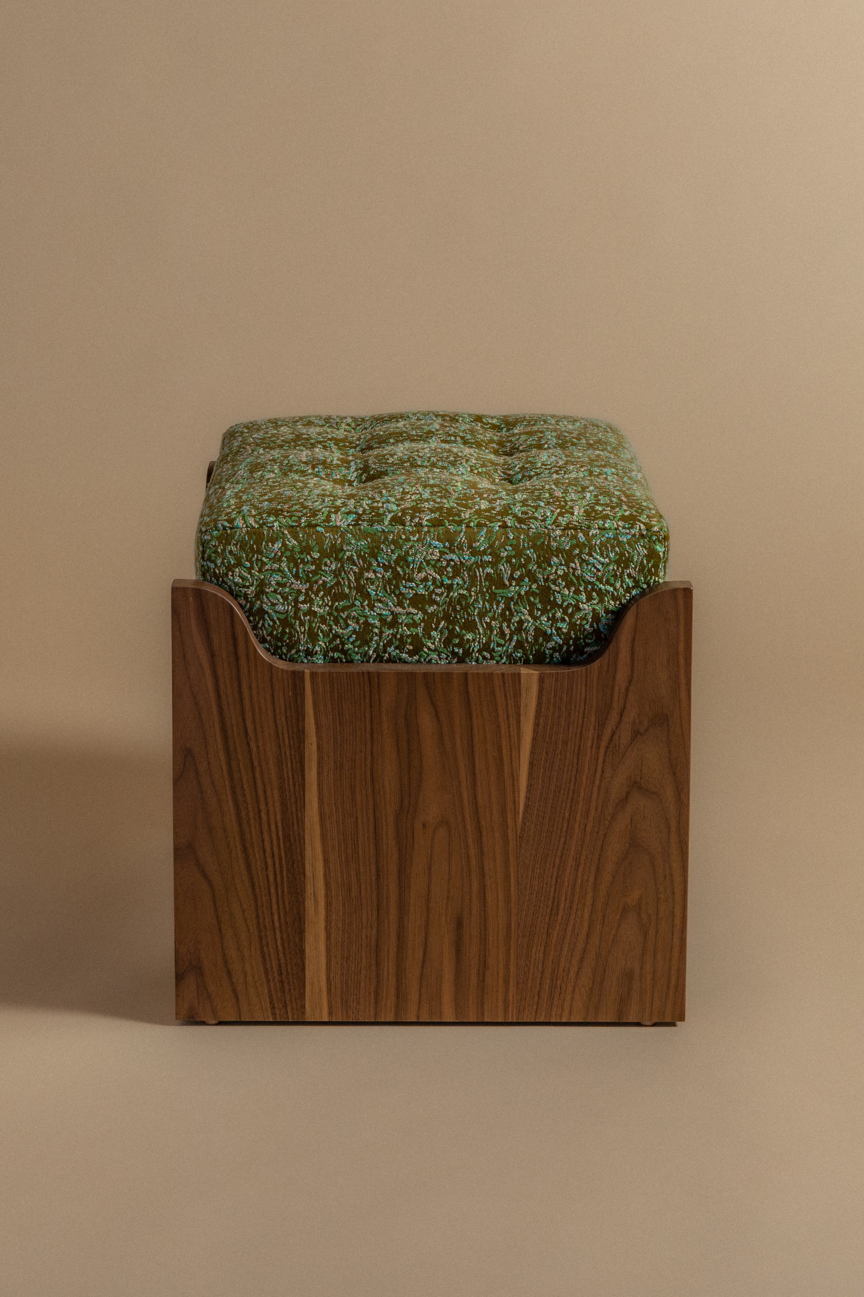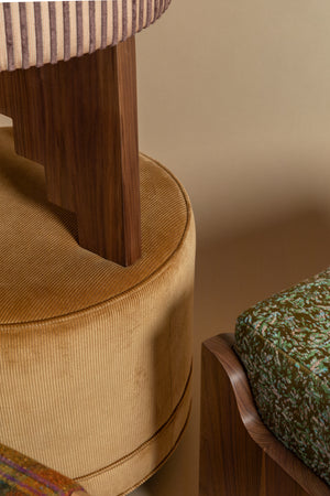 The Sovra's multi-functional design allows it effortlessly transitions from an occasional table—just add a tray—to a dynamic seating option especially when arranged in multiples. Each solid wood base is handcrafted. Available in six select Brunel fabrics with base options in white oak or walnut.