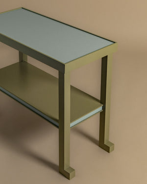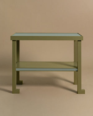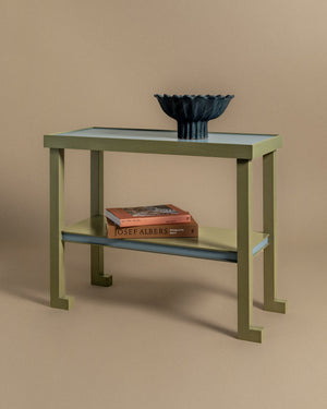 Pictured in two finishes, pigmented ash in verde marron with agave laminate, as well as pure walnut with lavender laminate.
