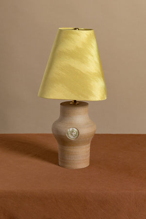 The Auri Lamp is a refined statement piece that blends organic form with modern elegance. Its hand-thrown ceramic base, crafted by Minneapolis based artist Nikki Norberg, features a sculptural silhouette and a hand-painted medallion—each one unique. Made from high-fire ochre-infused clay and left unglazed, the base highlights the raw texture and warmth of natural clay. A chartreuse moiré shade adds a sophisticated play of color and texture, while a corded dimmer switch allows effortless ambiance control.