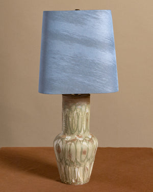Elegant ceramic table lamp featuring a sculptural base hand-made by Minneapolis-based artist Nikki Norberg, showcasing looping green and cream glaze motifs. It’s paired with a subtly textured moiré fabric shade in pale blue. The piece balances organic form and refined detail, bringing understated artistry and warmth to any interior.
