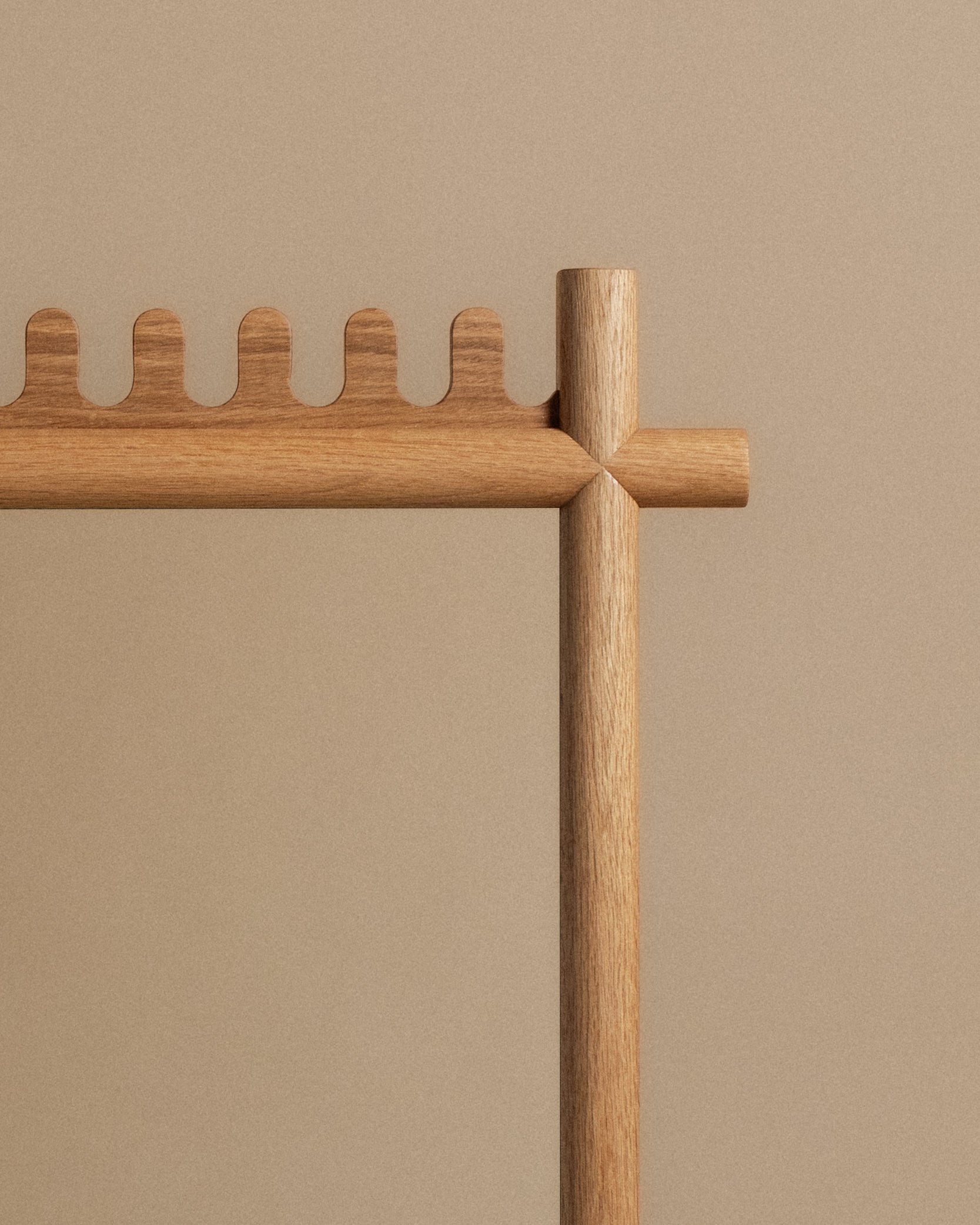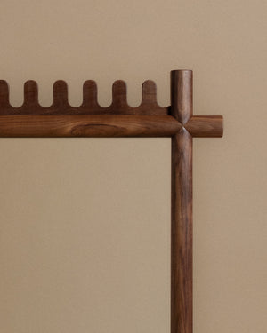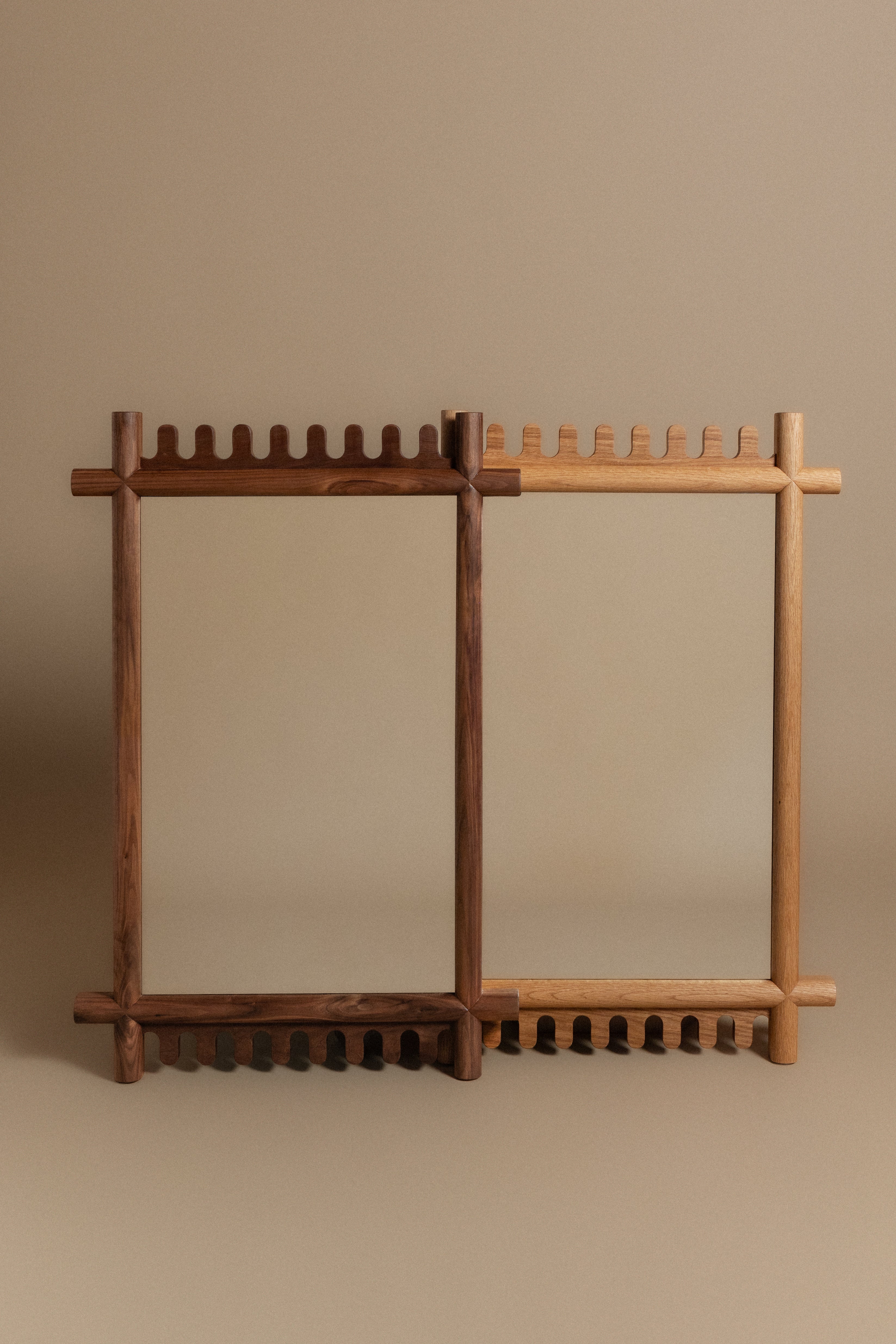 The Cordelia mirror features a solid wood frame with hand-carved details that nod to mid-century design, blending clean lines with organic craftsmanship. Available in either walnut or white oak, the bold geometric accents give it a sculptural presence, making it a timeless statement piece for any room.